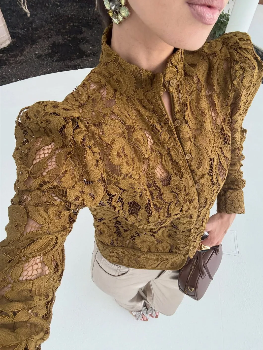 2026 Spring New See Through Lace Shirt Women Solid O Neck Long Sleeve Single Breasted Shirts Fashion New Female Blouse Tops