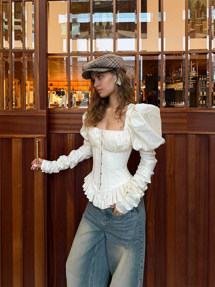 Spring Elegant Fishbone Pleated Shirt Women French Square Neck Puff Long Sleeves Backless Slim Blouses 2026 Lady Club Party Tops